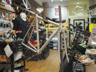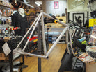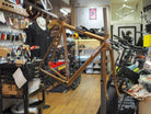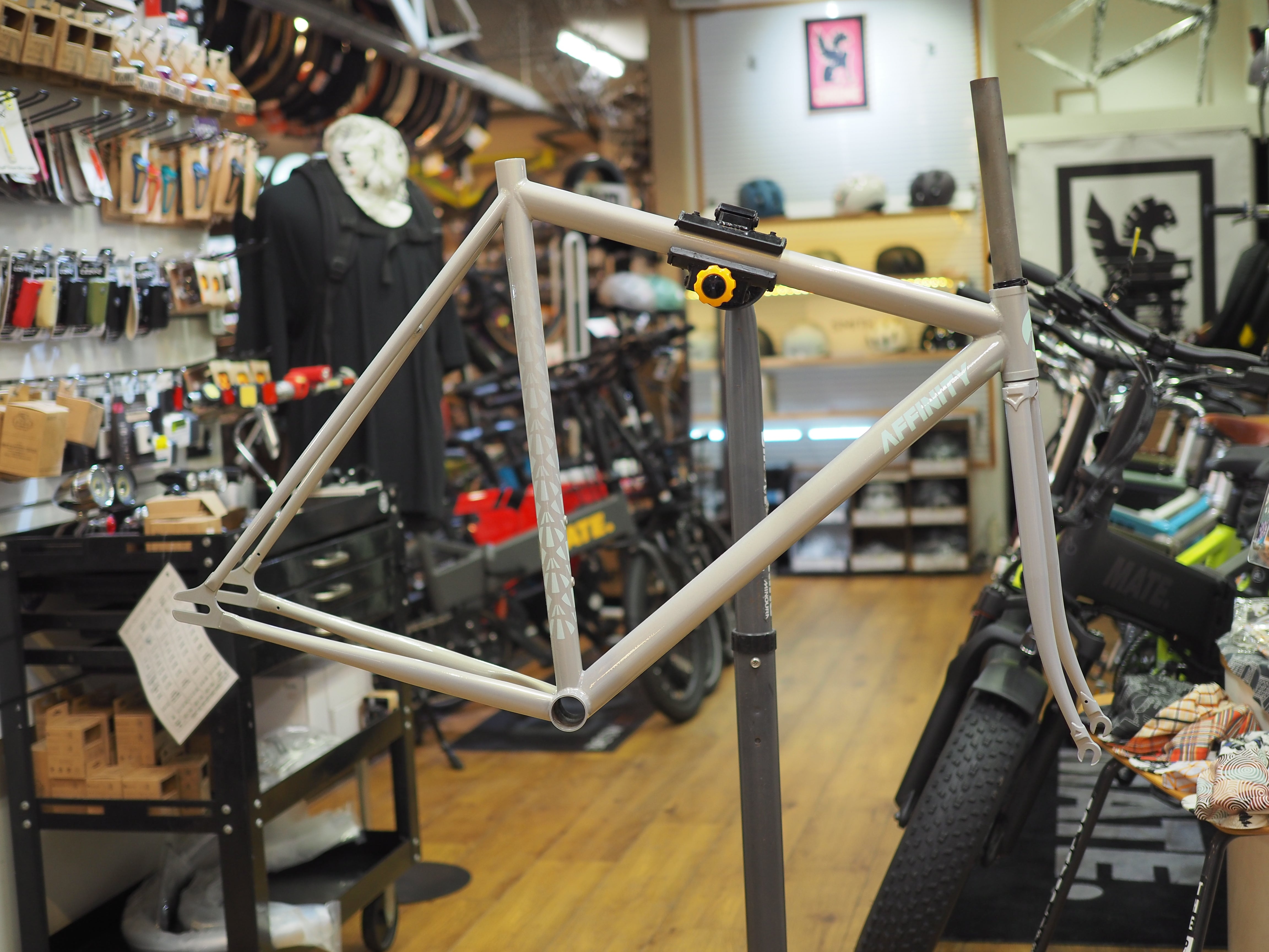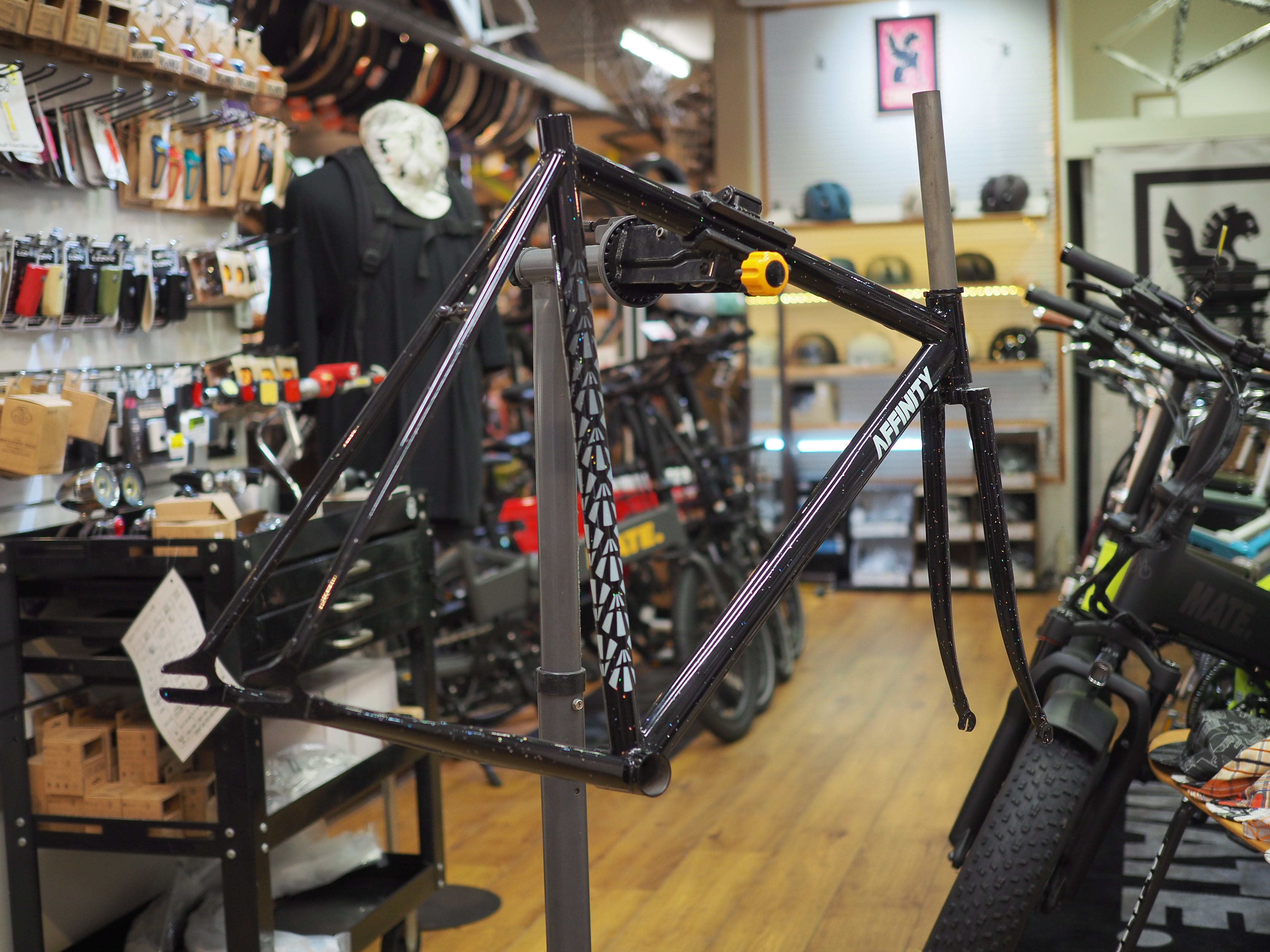 大きく前に下がったトップチューブが特徴的な1台です。